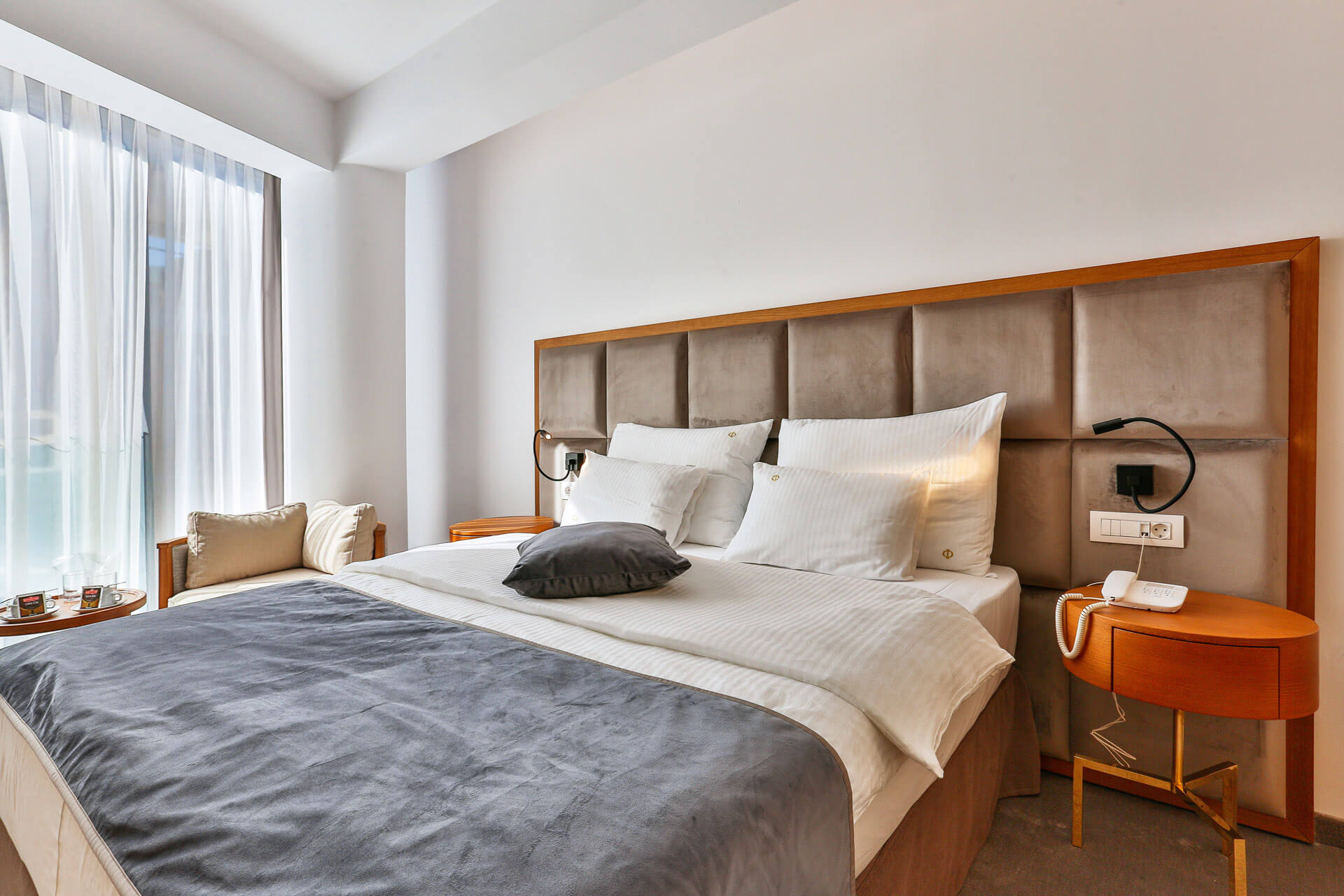 Standard double/twin room – cca 25m2, a vrsta kreveta u sobama je King size krevet, dimenzija 180×200, balkon. Maksimalna popunjenost – 2 osobe.