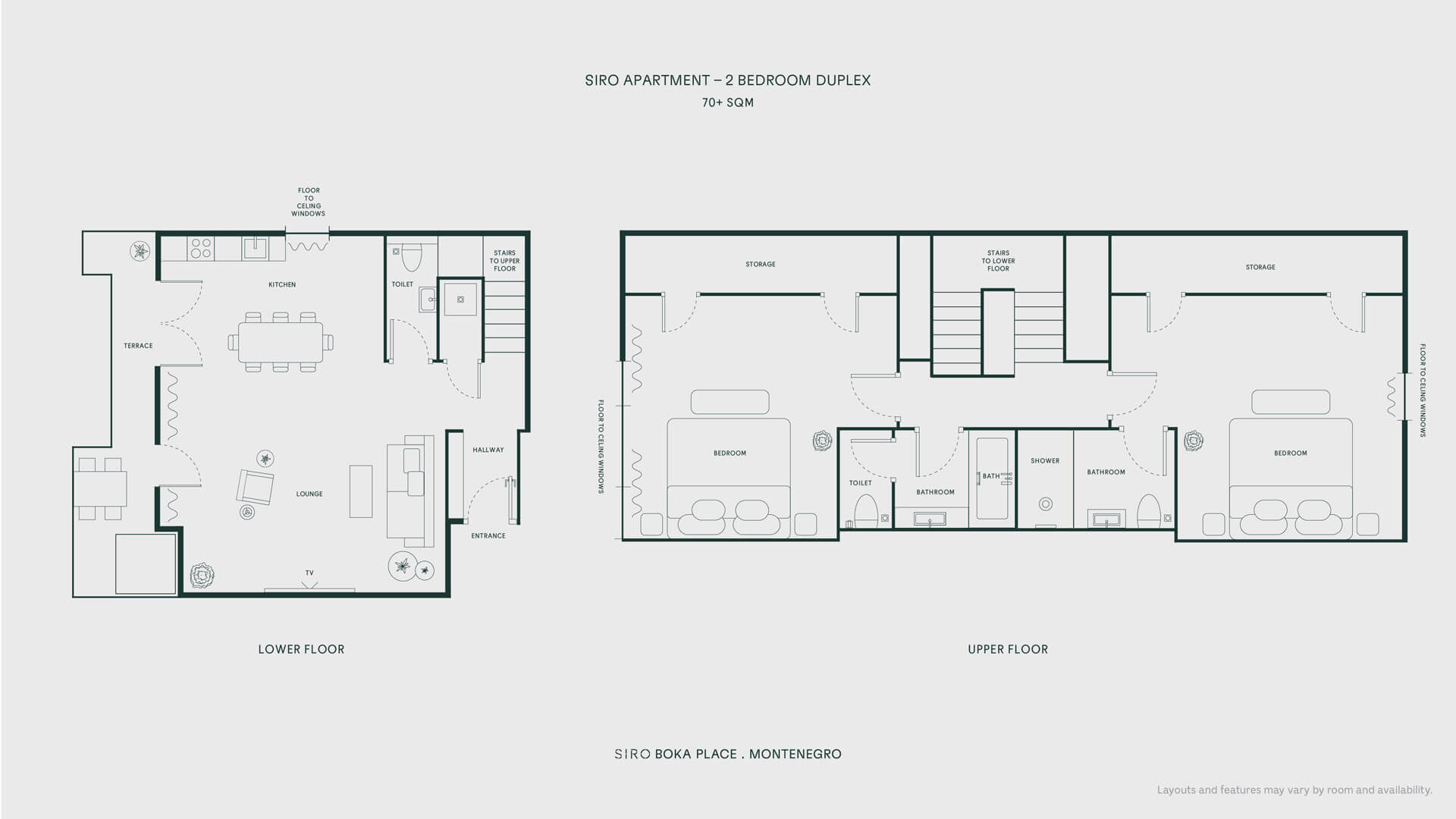 Siro apartman 2 bedroom duplex – 1 bračni krevet 200x200, 2 odvojena 100x200, 70m2. Maksimalna popunjenost 4 odrasle osobe + 1 osoba (odrasla ili dijete) (6 jedinica)